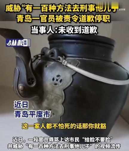 近日,山东平度一镇党委书记在做群众工作时言语失当,威胁上访者“有一百种方法去刑事他儿子” ,语气嚣张恶劣,如同黑社会作风,被曝光后在网上引发巨大争议。当地最新通报称对其作出停职处理,并责令向当事人赔礼道歉。已成立调查组,对事件进行调查,依法依规处置。