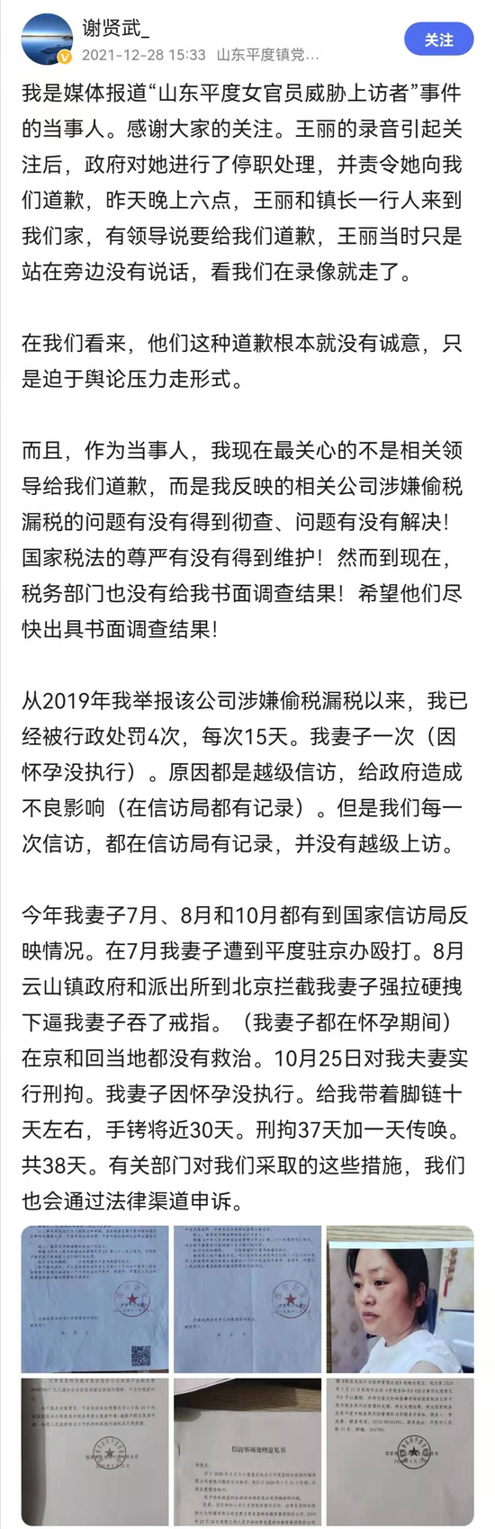 12月28日下午,“女书记威胁上访者”当事人在社交平台发文,称女书记王丽到他家道歉,却只是站在旁边没有说话,看当事人在录像就走了,该当事人认为这种道歉根本就没有诚意。