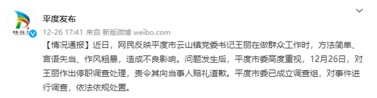 12月26日,山东平度市通过官方微博通报对此前平度市云山镇党委书记王丽言语失当情况的处理结果: