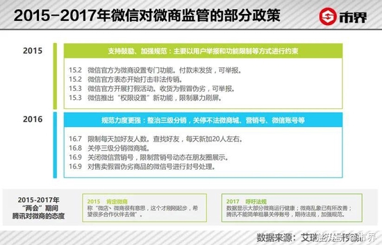 同时,各方面对于微商的监管也开始加速。2015年,工商总局首次明确提出将微商纳入监管;微信官方对微商的政策也从鼓励转变为严肃监管,从“打假活动”、限制暴力刷屏到后来限制每天加好友人数、关停三级分销微商城、关闭微信营销号等等;2017年,微商法律规范征求意见稿公布。