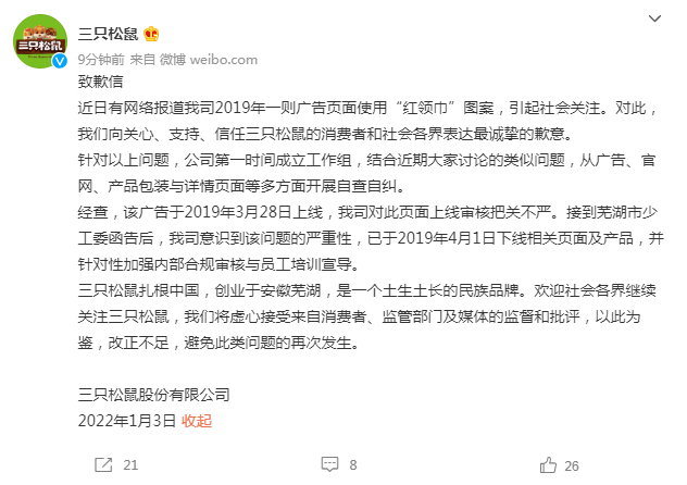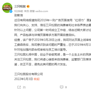 近日有网络报道我司2019年一则广告页面使用“红领巾”图案,引起社会关注。对此,我们向关心、支持、信任三只松鼠的消费者和社会各界表达最诚挚的歉意。