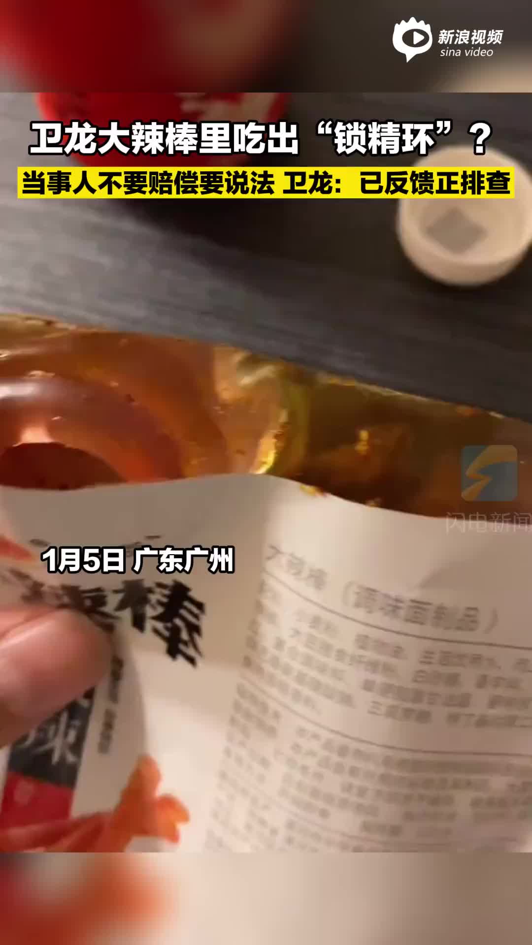 1月5日,广东网友吴先生在吃卫龙辣条大辣棒时,在包装袋内底部发现异物,吴先生当时怀疑是情趣用品“锁精环”,随后吴先生通过社交平台发布视频。1月6日上午闪电新闻记者致电卫龙官方,对方回应称已反馈给工厂并在排查中。吴先生表示不接受赔偿金,只需要合理说法。