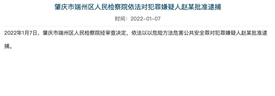 1月10日,澎湃新闻(www.thepaper.cn)肇庆市端州区人民检察院处获悉,7日,检方依法以以危险方法危害公共安全罪对犯罪嫌疑人赵某批准逮捕。