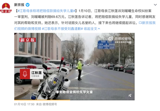 原标题:江歌母亲称拿到赔偿款将捐出!还将继续起诉这些人……