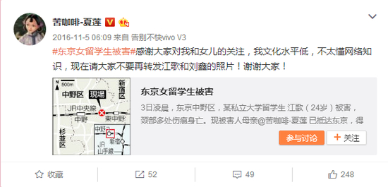2016年11月4日凌晨3点,江妈发了江歌遇害后的第一条微博,呼吁在日留学生督促警方破案,并留下手机号让大家加她微信。这条微博后来被大量转发。