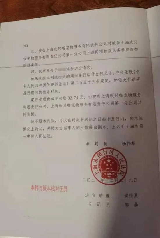 2021年12月,上海的于先生在玖只喵宠物店购买的宠物猫染病死亡后,将该公司告上法庭。
