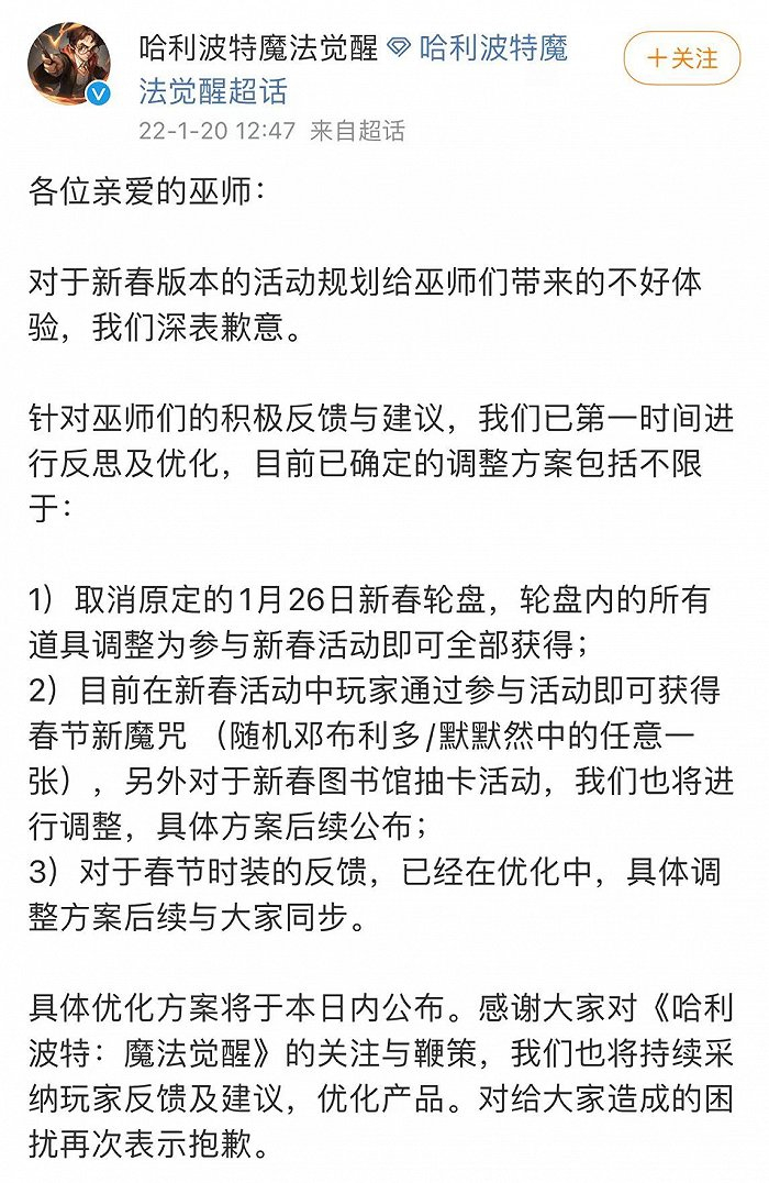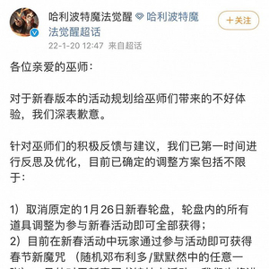 1月20日消息,因新春版本活动规划引发玩家不满,#万人请辞哈利波特魔法觉醒策划#话题冲上热搜第一。对此,@哈利波特魔法觉醒 官博发文致歉表示,已第一时间进行反思及优化,具体优化方案将于本日内公布。