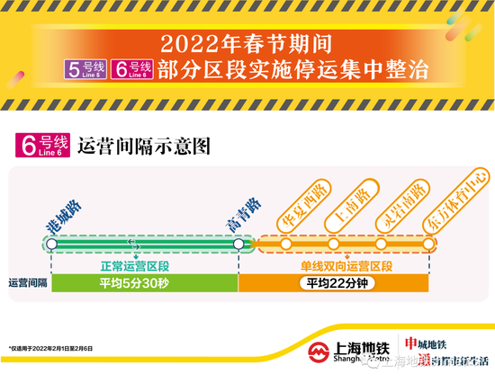 为保障列车运行轨道及隧道结构安全,2022年春节长假期间(2月1日至6日,年初一至年初六),5号线莘庄站至颛桥站(不含)区段实施停运集中整治。期间,5号线行车交路调整为颛桥站至奉贤新城站、颛桥站至闵行开发区站。同时,6号线高青路站至东方体育中心站区段上行线,即往东方体育中心站方向实施单向停运集中整治。期间,6号线行车交路调整为港城路站至东方体育中心站、港城路站至高青路站的大小交路。其中,华夏西路站至东方体育中心站区段使用下行线单线双向运行。在市交通委的统筹协调下,届时闵行区、浦东新区、轨交公安、公交等将与上海地铁多方联动,共同保障市民乘客节日出行和宣传引导工作。