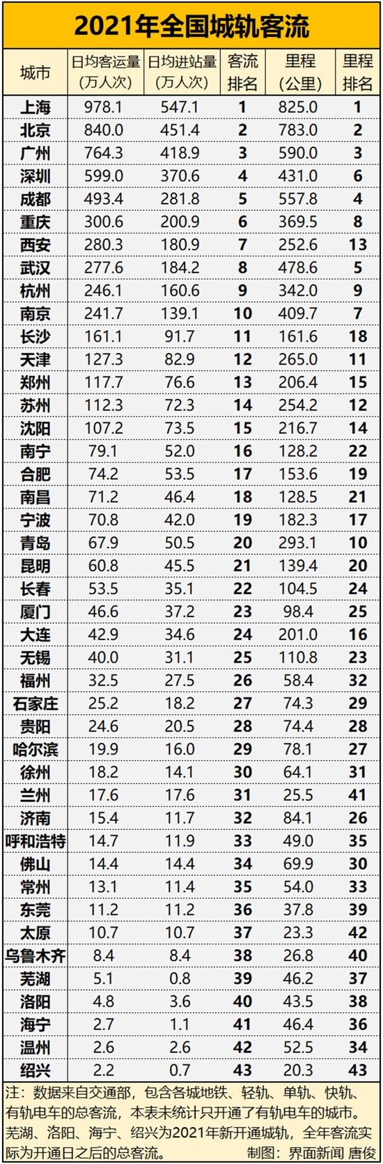 原标题:2021年城市地铁客流量排名,你坐的地铁挤不挤?