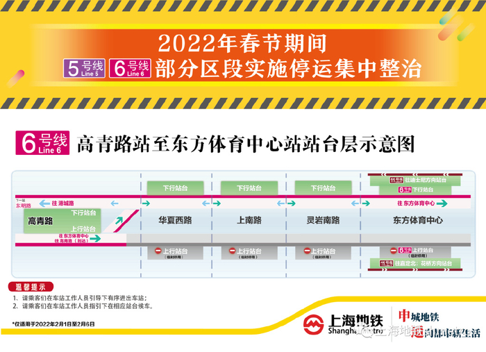 2月1日至2月6日,6号线高青路站至东方体育中心站区段上行(往东方体育中心方向)单向实施停运集中整治。为此,6号线行车交路调整为港城路站至东方体育中心站,以及港城路站至高青路站的大小交路。其中,华夏西路站至东方体育中心站区段使用下行线单线双向运行。
