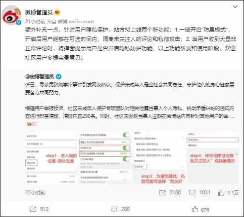 事后,微博回应刘学州事件,表示拟上线新功能检测网暴。图片来源:微博截图