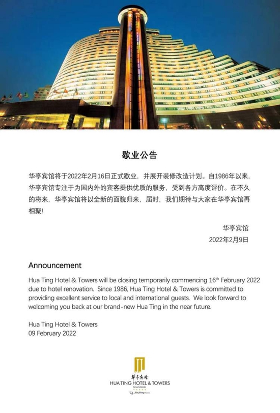记者今日获悉,上海第一家五星级酒店—华亭宾馆宣布将在2022年2月16日正式歇业,并开展装修改造计划,具体归期未定。