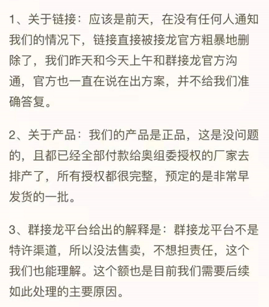 “团长在后台还是可以看到登记购买的消息,如果不退款,到时候还是可以向已下单的团友发货。”据小阳了解,有些团长可能是通过相关生产渠道采购到正品,但此次北京冬奥会特许商品的线上销售渠道只有天猫旗舰店,因此才会有这一场风波,“当然了,我也看到了很多明显是非正品的,有的说是‘3D打印版’,有的还直接注明‘义乌发货’。”
