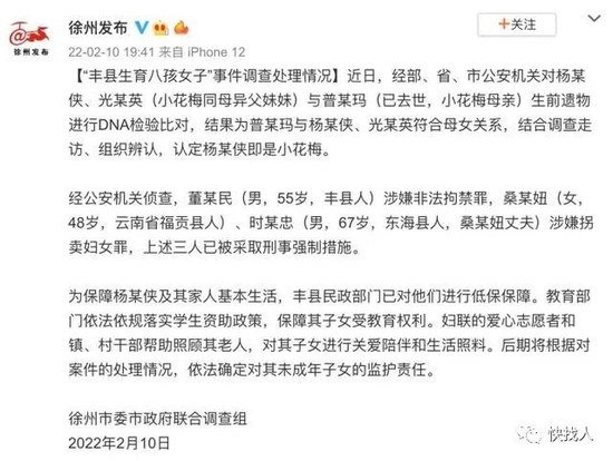从徐州发布的第三份通报中显示:8个孩子与杨某侠、董某民符合生物学亲子关系。