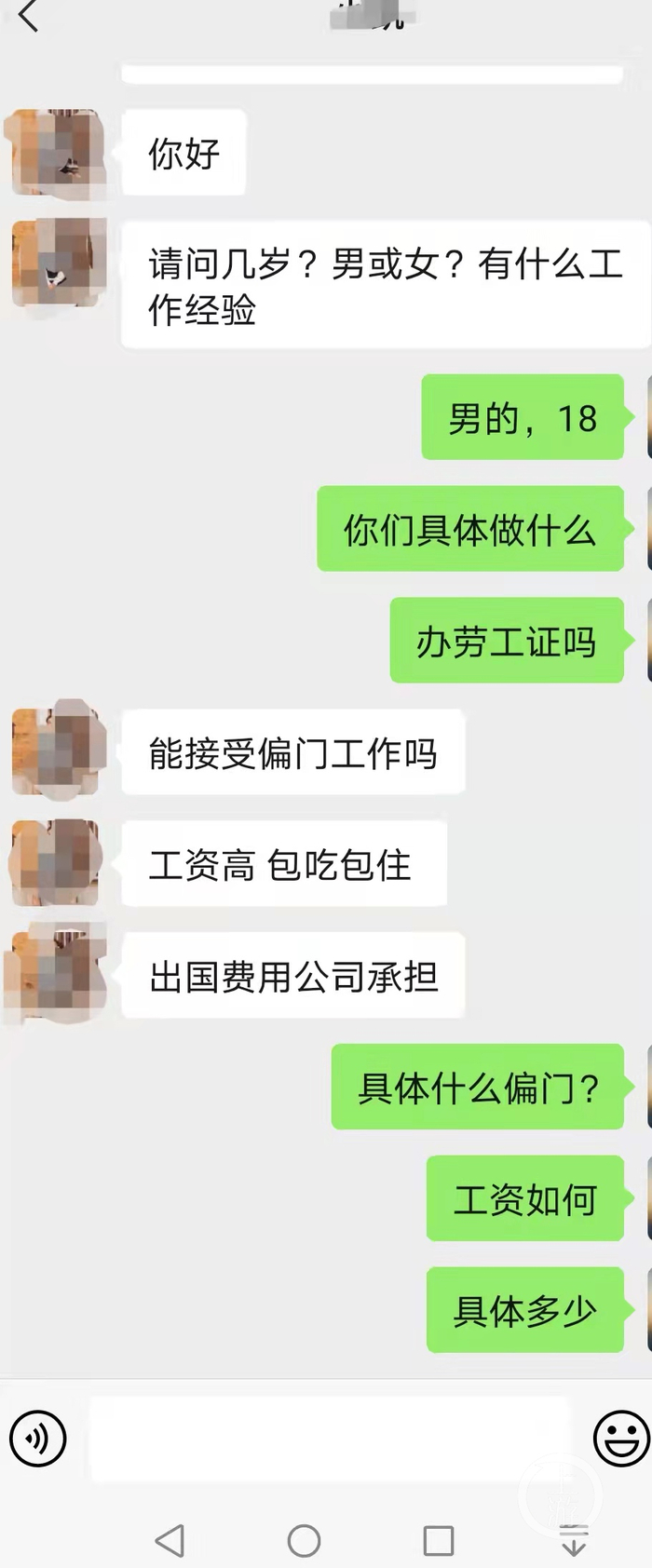 上游新闻记者注意到,其中有一则招聘信息提到“公司因业务发展需要招工”,但对招工的具体要求没有写明。随后,记者加上了招聘页面留下的微信号,对方只询问了年龄、性别、有无工作经验,随后便表示:“能接受偏门工作吗,工资高,包吃包住,出国费用公司承担。”
