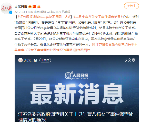 丰县生育八孩女子事件调查结果公布:针对“杨某侠可能是四川籍失踪女子李莹”的问题,公安机关开展专门调查。经江苏公安机关会同四川公安机关将李莹母亲与杨某侠进行DNA检验比对,结果排除生物学亲子关系。后经南京医科大学司法鉴定所对李莹母亲与杨某侠进行DNA检验比对,结果仍排除生物学亲子关系。2月20日,经公安部物证鉴定中心鉴定,再次排除李莹母亲和杨某侠存在生物学亲子关系。据此认定杨某侠与李莹不是同一人。