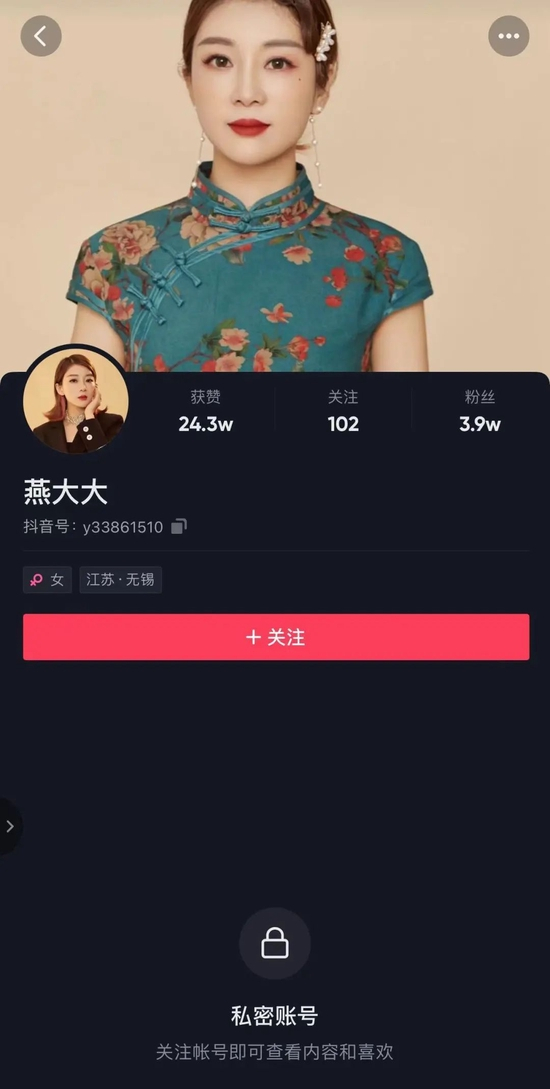 目前,陈晓燕的抖音账号“燕大大”已设置为私密账号。截至发稿,该抖音账号拥有3.9万粉丝,获赞24.3万个。
