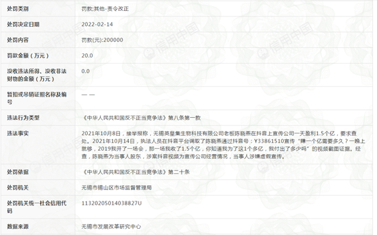 近日,信用中国披露了一则无锡英皇集生物科技有限公司(下称“英皇集科技”)的行政处罚信息。