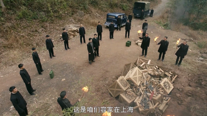 他的一位手下表示“少爷,这是咱们容家在上海所有的鸦片囤货”,随后几位群演便将火把一起扔到装有鸦片的木匣上。