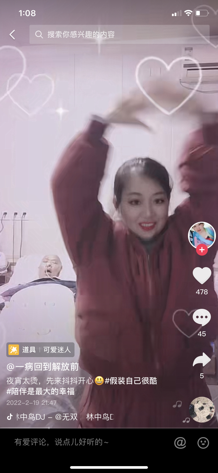 她在丈夫病床前跳舞的短视频火了,网上有人留言,说她是潘金莲,要气死老公;她不以为意,甚至想出了一个新的笑话:“‘金莲’这名字太土了。你们要么叫我阿莲。”唯一伤害到她的评论,是说她滤镜美化后的外表过于好看,“面相克夫”。