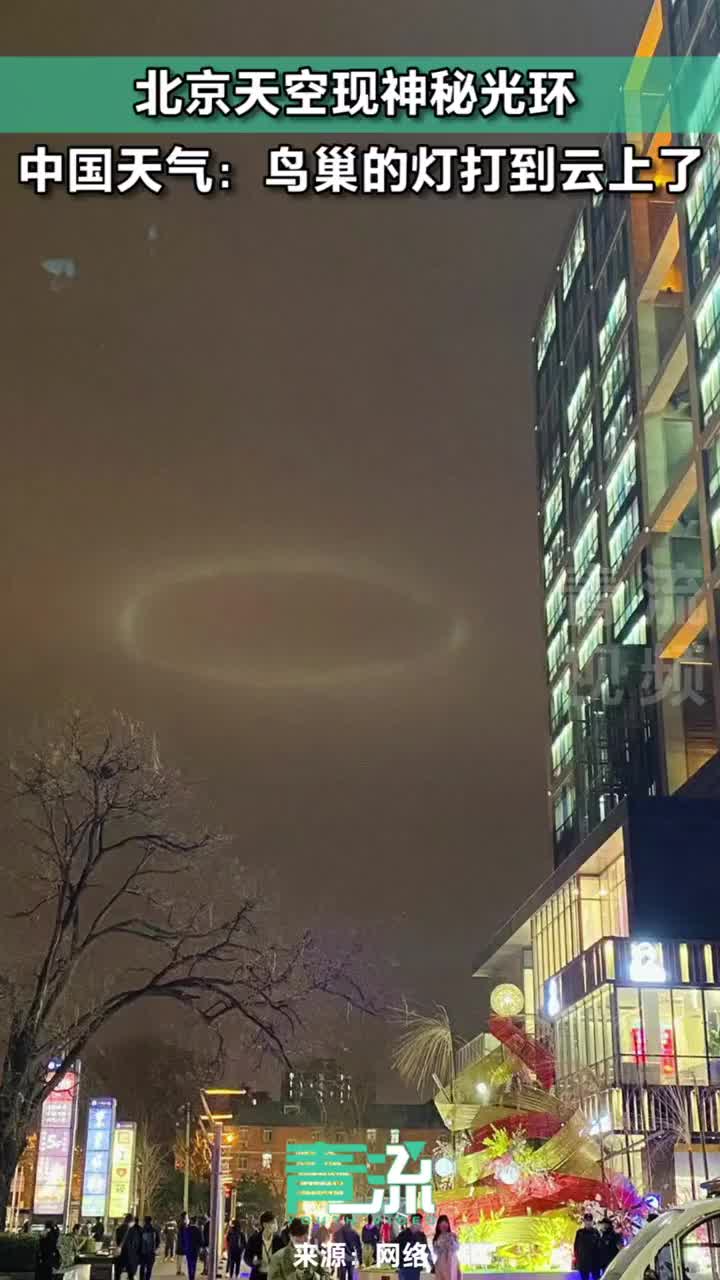 3月11日,有网友发现北京天空出现了一个神秘光环,若隐若现、朦朦胧胧。@中国天气 发文称:应该是鸟巢的灯光打到云上了。