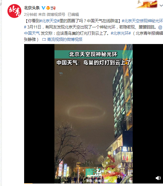 3月11日,有网友发现北京天空出现了一个神秘光环,若隐若现、朦朦胧胧。@中国天气 发文称:应该是鸟巢的灯光打到云上了。