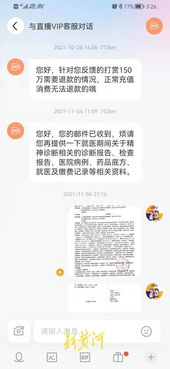 从2021年10月起,张敏茹尝试联系陌陌,通过陌陌客户端在线客服反馈情况,被对方告知“正常充值消费无法退款”。之后,张敏茹又通过邮箱进行反馈情况,对方要求提供给当事人就医期间关于精神诊断相关的诊断报告、检查报告、医院病例等相关资料。张敏茹在提交了一系列资料之后,却再无收到相关回应。无奈之下,11月9日,张敏茹从南京坐车来到北京陌陌科技有限公司。一位接待他的工作人员表示,只有家属提供当事人没有民事行为能力或者限制民事行为能力的证据,公司才会考虑予以退款或部分退款。“发病期与打赏期高度重合,医院诊断证明也有,还需要什么证据?”2022年2月,张敏茹再次到陌陌公司,双方依旧协商未果。日前,新黄河记者多次尝试联系陌陌公司询问此事,未能与相关负责人取得联系。