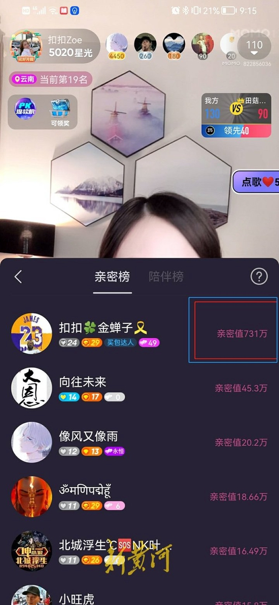 两人很快熟络起来。在袁伟志看来,“扣扣ZOE”不仅人美歌甜,还特别善解人意,自己深夜三点失眠的时候,她能够陪着自己语音聊天,一聊就是三个多小时。同样地,袁伟志为了讨“女神”欢心,也没有停下打赏的步伐。他把自己的陌陌名称改成“扣扣金蝉子”,在扣扣ZOE直播间多次“砸钱”,经常每次出手就是三四万元,一次次送出“帝王套”,乐得对方合不拢嘴。熟悉直播的用户都了解,所谓“帝王套”就是把所有礼物都刷一遍。在“扣扣金蝉子”的助力下,“扣扣ZOE”多次进入多个时段的“全国小时榜”,以及云南地区小时榜的第一名。当之无愧地,“扣扣金蝉子”也牢牢占据着扣扣ZOE直播间“榜一大哥”的位置。“前后两个多月时间,总共给她一人打赏了73.1万元。”