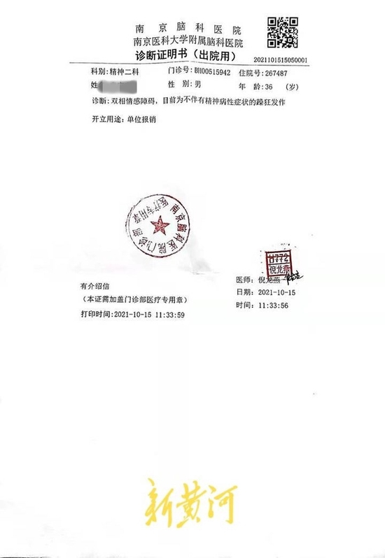 8月中旬,袁伟志行为表现越发怪异,随着网贷“窟窿”越来越大,打赏之事也终于彻底暴露。家人在悲愤之余,咨询了南京当地几家医院,基本确认他为典型的躁狂发作症状。9月,袁伟志的家人多次将他送往医院强制就医,被医院正式诊断为双相情感障碍。