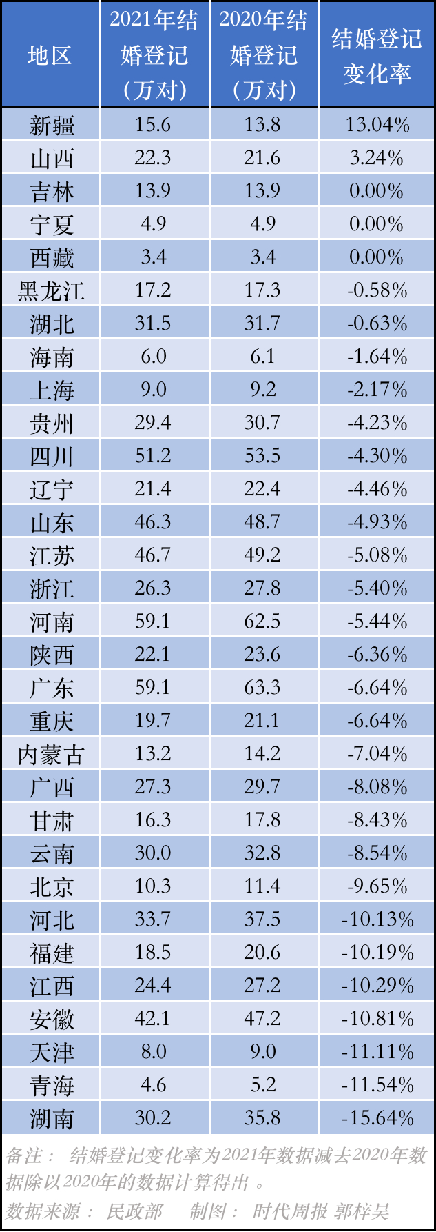 时代周报记者梳理发现,2021年仅新疆、山西结婚登记人数相对上一年呈现增长态势,增幅分别为13.04%和3.24%。西藏、宁夏、吉林3省份的结婚登记人数与上一年持平。