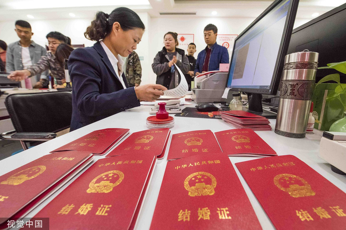 2021年中国结婚登记数据为763.6万对 图源:视觉中国