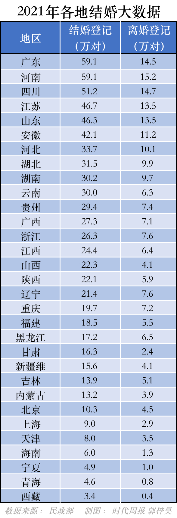 时代周报记者梳理发现,广东、河南结婚人数并列第一,均为59.1万对。从31个省份数据看,结婚对数前十的省份分别是广东/河南、四川、江苏、山东、安徽、河北、湖北、湖南、云南和贵州。