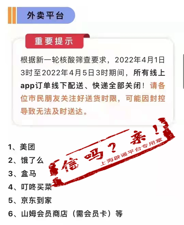 这些天,买菜、买药、外卖仍旧是市民最关心的话题。3月30日,一条“4月1日3时至2022年4月5日3时期间,所有线上app订单线下配送、快递全部关闭”的通知很受关注。该通知称,美团、饿了么、盒马、叮咚买菜、京东到家、山姆会员商店等提供“线上下单、线下配送”的app都将停止运行。上海辟谣平台很快查清,该通知并非覆盖全市,而是出自松江区佘山镇。