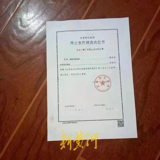 “派出所给的答复是殴打没有证据,当事人未成年,他们调查,说小旭和我女儿还是好朋友,并且30元也退了。”张会海向新黄河记者提供了一张落款为吉首市公安局的“终止案件调查决定书”,上面写着“小华被敲诈勒索案”没有违法事实,终止调查,但并未写明具体日期。4月12日下午,新黄河记者致电吉首市峒河派出所核实,接电话的民警称确有此事,并表示向上级申请后给记者回电话。“有给他处理好、协商好。现在什么事都是公开的,不可能有隐瞒的。”截至发稿前,新黄河记者未收到回复。