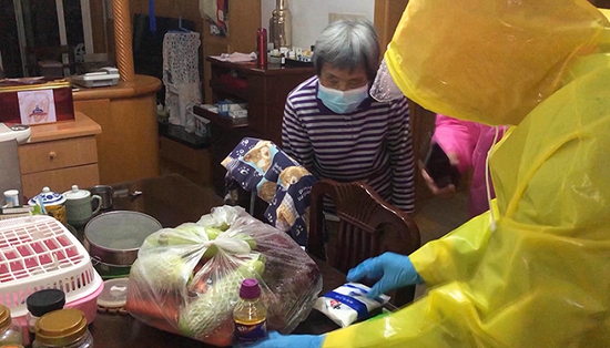 小区里的老年人收到满载爱心的生活物资,纷纷表示感谢。