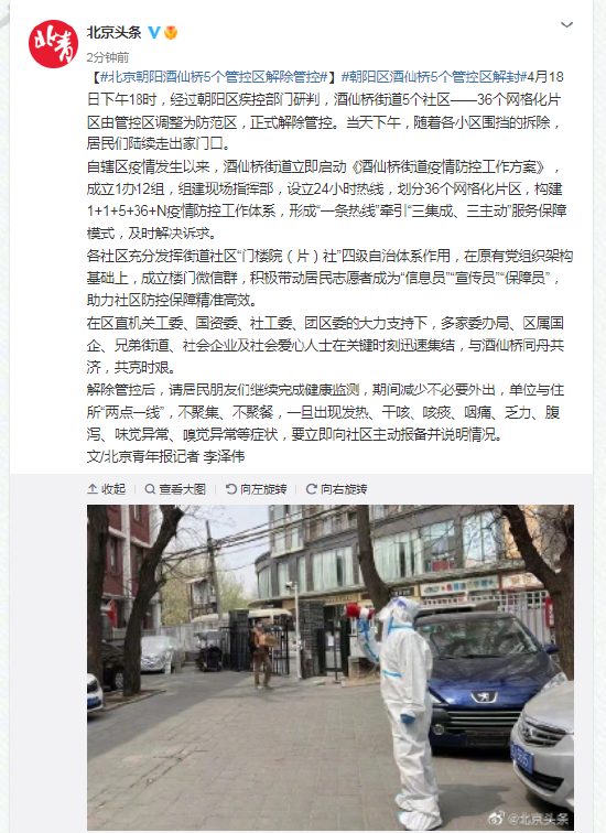 北京朝阳酒仙桥5个管控区解除管控
