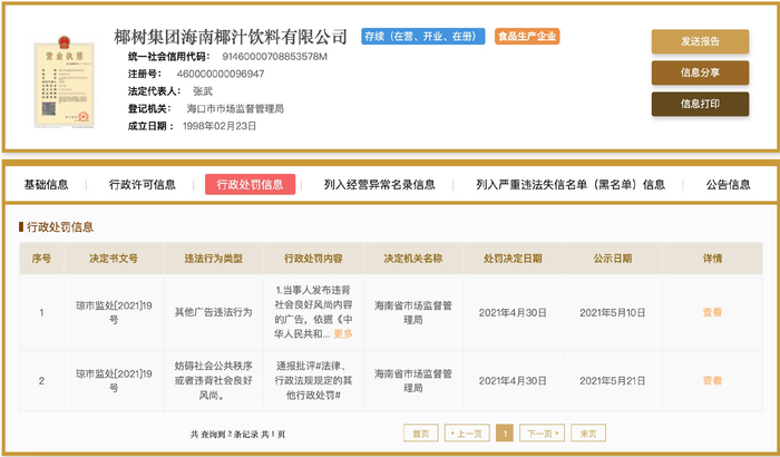 2019年3月27日,海口市龙华区工商局认定椰树集团广告妨碍社会公共秩序或者违背社会良好风尚,对椰树集团海南椰汁饮料有限公司进行了罚款20万元的行政处罚。处罚依据是广告法第九条“广告不得含有淫秽、色情、赌博、迷信、恐怖、暴力的内容”。