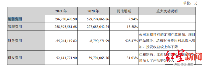 2021年,仁和药业实现营收49.36亿元,归母净利润6.65亿元。但销售费用却高达5.96亿元,同比增长2.94%,销售费用率为12%;而其研发费用却仅为5214.38万元,研发费用率仅为1.06%,研发费用还不到销售费用的十分之一。