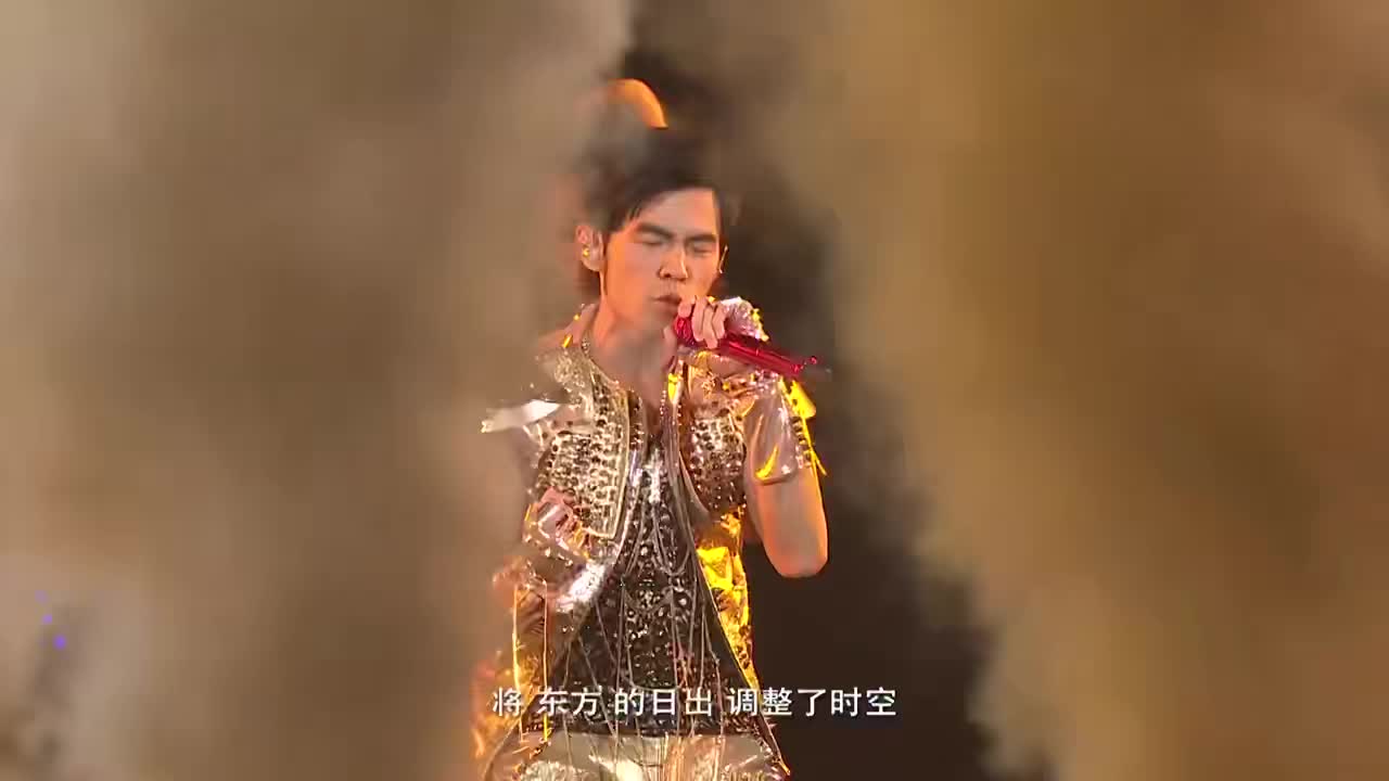 一艘炫酷的蓝光螺旋飞行器降临在舞台上,周杰伦身着雕花古铜盔甲战服登场, 在《惊叹号》的音乐中,露出了他结实的8块腹肌(限量版)。