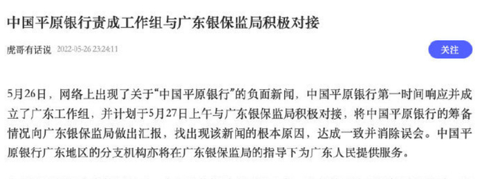 5月27日,广州住房公积金管理中心在其官网发布《关于“中国平原银行”发布不实信息的严正声明》称,该中心在工作中发现,有人在网络平台、社交媒体上捏造事实,散布关于“中国平原银行”与其有关的虚假信息。