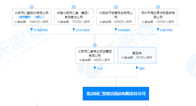 天眼查APP显示,北京同仁堂股份有限公司(600085.SH)间接控股北京同仁堂南京药店有限责任公司。公开资料显示,北京同仁堂股份有限公司为同仁堂集团旗下上市公司,于1997年在上交所上市,因实体药店在国内分布多且早,也被称为“中华老字号”。
