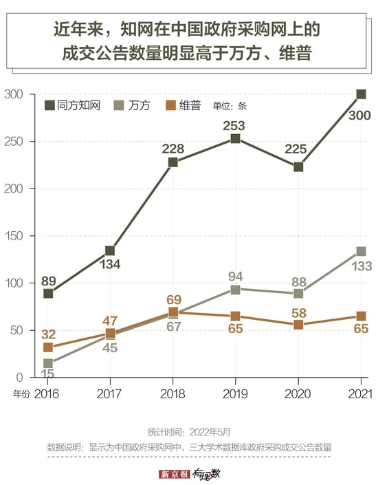 《学术研究》杂志社助理研究员李静,曾在《学术类数据库的格局、争议及其发展——以“中国知网”为例》中指出:知网、万方、维普,作为国内学术数据库的“三驾马车”,就收录范围看,知网在期刊种类,引文数量,更新周期、用户规模等都占据着绝对优势。在中国政府采购网上,可以明显看出,近几年来,知网的成交公告数量要高于万方、维普两家数据库。