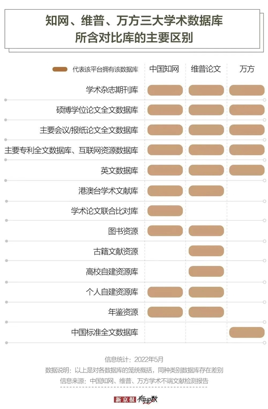 查重的基本方法,实际就是将论文同数据库中的学术文章作文本相似性的对比,所以,存有的论文数量,拥有何种类型的资源库,都会影响到被检测论文的重复率。在知网、万方、维普的检测报告中,会显示它们各自的检测范围。通过粗略分类,可以看出不同数据库之间存在的差别。这就意味着,不同的查重平台,得出的查重率可能会存在很大出入。