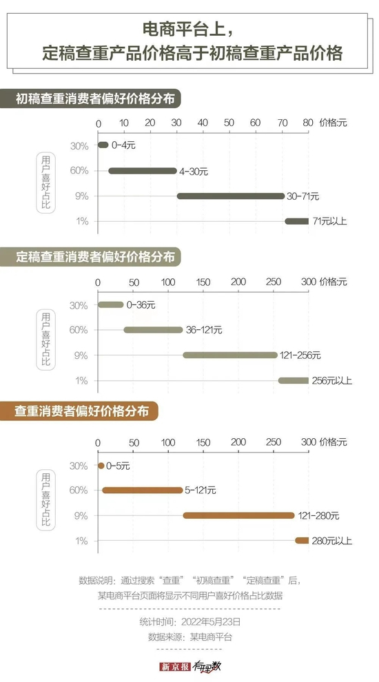 通过消费者偏好的价格,我们可以了解到,消费者购买初稿查重的服务价格集中在4-30元,定稿的集中在36-121元。但是,许多毕业生可能会重复多次购买初稿、定稿查重服务。这样看来,毕业生为了查重,实际花费可能远不止这些。根据媒体报道,曾有学生前后修改四次毕业论文,前后查重花费达到了1000多元。同时,学生还可能遭遇频繁涨价的情况。