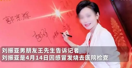 据刘振亚的男友描述,她是4月14日因感冒发烧去医院检查,结果发现肺部感染,医生建议她做进一步检查,在检查支气管时出现口腔鼻腔出血。
