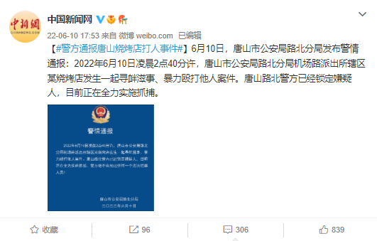 6月10日,唐山市公安局路北分局发布警情通报:2022年6月10日凌晨2点40分许,唐山市公安局路北分局机场路派出所辖区某烧烤店发生一起寻衅滋事、暴力殴打他人案件。唐山路北警方已经锁定嫌疑人,目前正在全力实施抓捕。