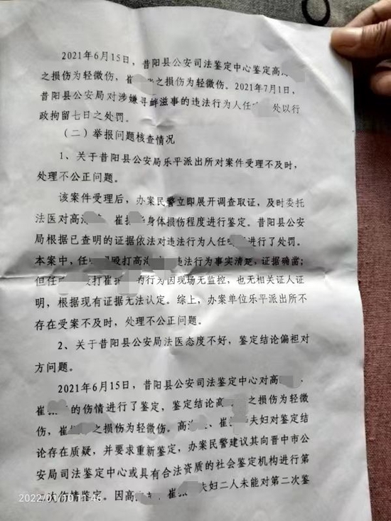 此外,“答复函”中还称,高先生夫妇对鉴定结论存在质疑,并要求重新鉴定,办案民警建议其向晋中市公安局司法鉴定中心或具有合法资质的社会鉴定机构进行第二次伤情鉴定。因高先生夫妇二人未能对第二次鉴定机构做出选择,未能提供第二次伤情鉴定结论,昔阳县公安局遂依据2021年6月15日昔阳县公安司法鉴定中心对高先生做出的轻微伤鉴定结论,对涉嫌寻衅滋事的违法行为人任某处以行政拘留七日的处罚。鉴定结论不存在偏袒对方的问题。