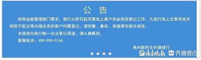 记者从禹州新民生村镇银行官网看到,公告为“按照金融管理部门要求,我行从即日起开展线上客户资金信息登记工作。凡我行线上交易系统关闭后不能正常办理业务的客户均需登记,请完整、真实、准确填写相关信息。本链接为我行唯一合法登记渠道,请认真甄别。”