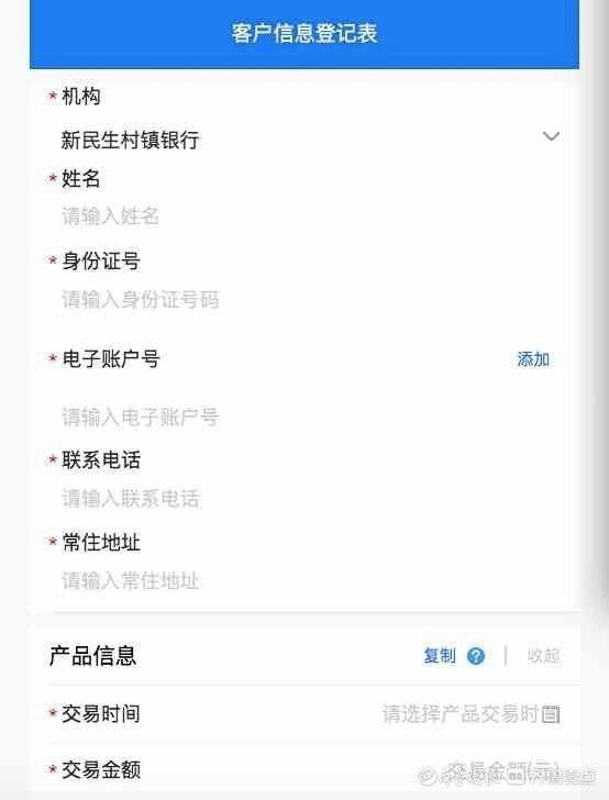 点击该公告后,即进入了客户信息登记表页面。记者注意到,登记表内需要填写姓名、身份证号、电子账户号、联系电话、常住地址等基本信息,还需要填写产品信息,包括交易时间、金额,产品名称、年利率,交易渠道,已获取收益,获取收益方式等内容。此外还有一条补充信息,为“是否存在通过其他渠道获取收益”。