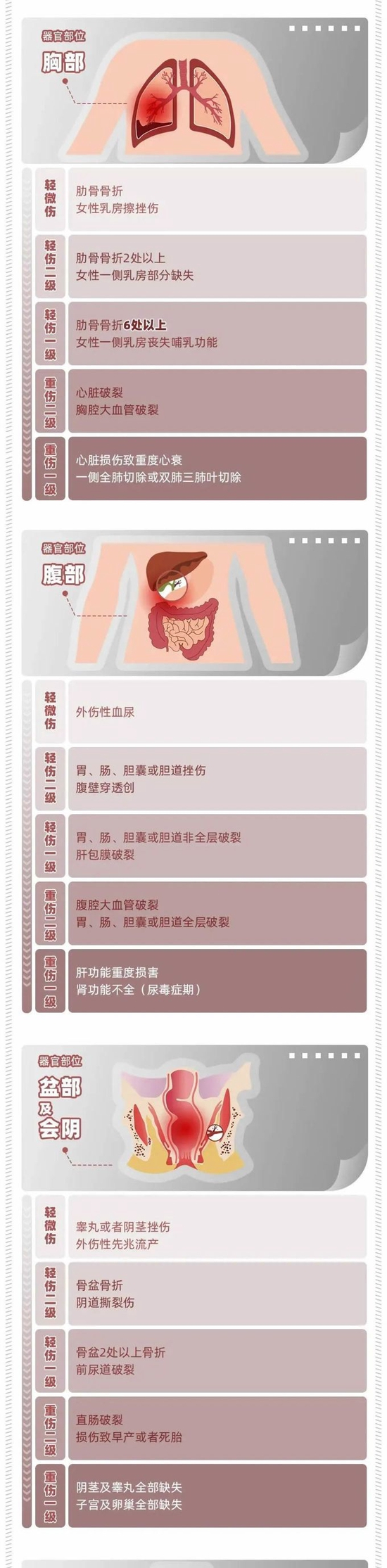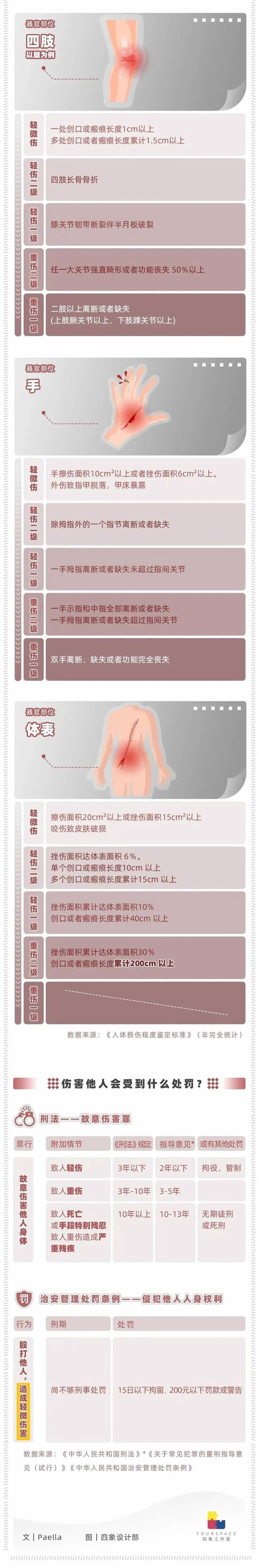 搜狐四象工作室查阅了我国的《人体损伤程度鉴定标准》以及刑法和治安管理处罚条例中关于故意伤害和侵犯他人人身权利的相关判定标准后,制作了一张损伤程度分级图。